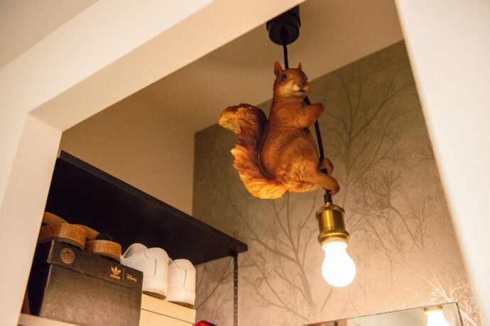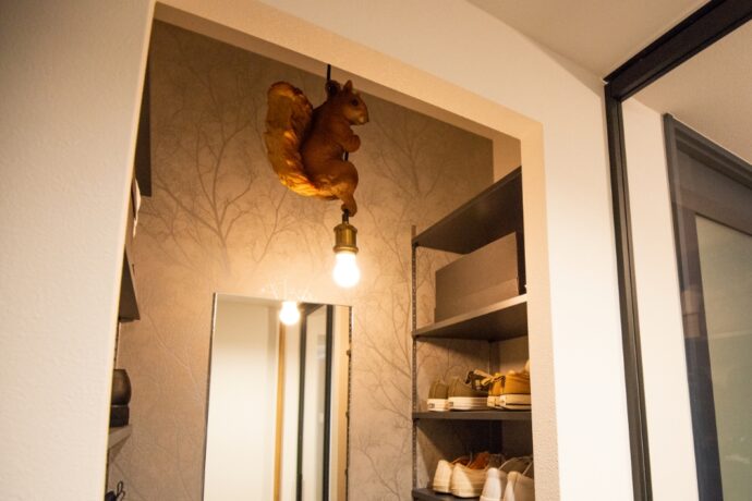 SICの壁紙には、エッジの効いた木立ちのシルエットが美しい壁紙を採用、リスの居る照明器具もSさん夫妻のセレクトです。