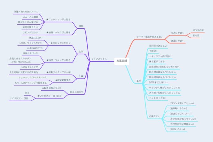 はじめにSさんから見せていただいたのは、お二人作成の「お家妄想MAP」。物件探しの段階から、希望を整理して書き出したものだそうです。