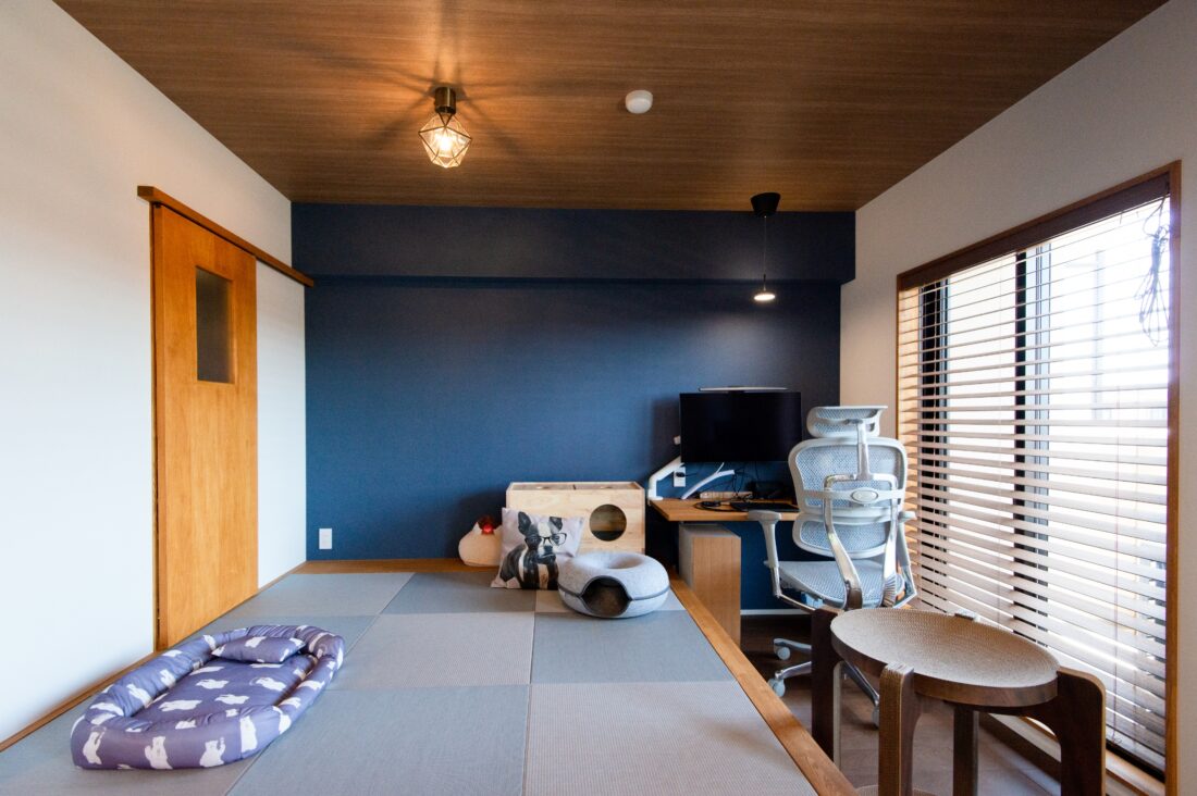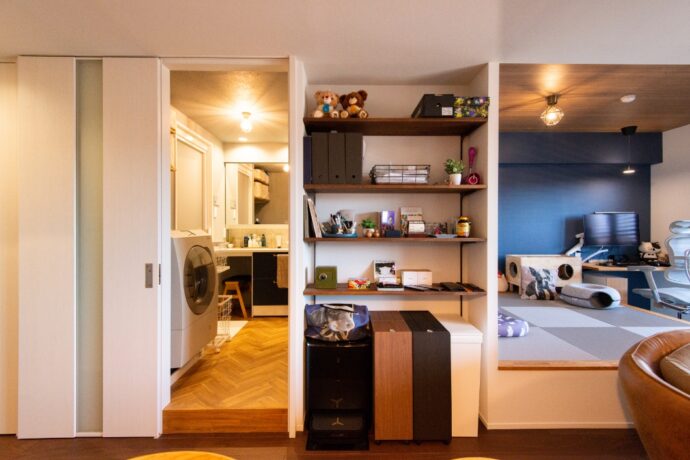 週に一度はリモートワークというSさん、クリエイターというお仕事柄、ご自宅でお仕事される機会も多いそう。集中はしたいけれど、部屋に一人こもってしまうのも寂しいし…ということで、リビングの隣に空間を区切らないオープンなワークスペースをつくりました。濃いアクセントクロスの壁に向かうことで集中しつつ、背中には家族の存在を感じられます。そしてたっぷり収納が叶うコアガリの畳スペースをつくりました。扉を開けると、WTC(ウォークスルークローゼット)→洗面・バスルーム→リビングと回遊動線でつながっています。