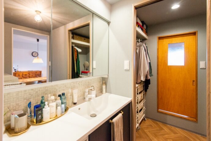 すぐ横にはWTCを設置、身支度が一か所で完結できます。ポイントは回遊動線であること、同時に動いてもぶつかることがありません。ヘリボーン柄のクッションフロアはリビングの雰囲気ともマッチ、違和感なく空間をつないでいます。