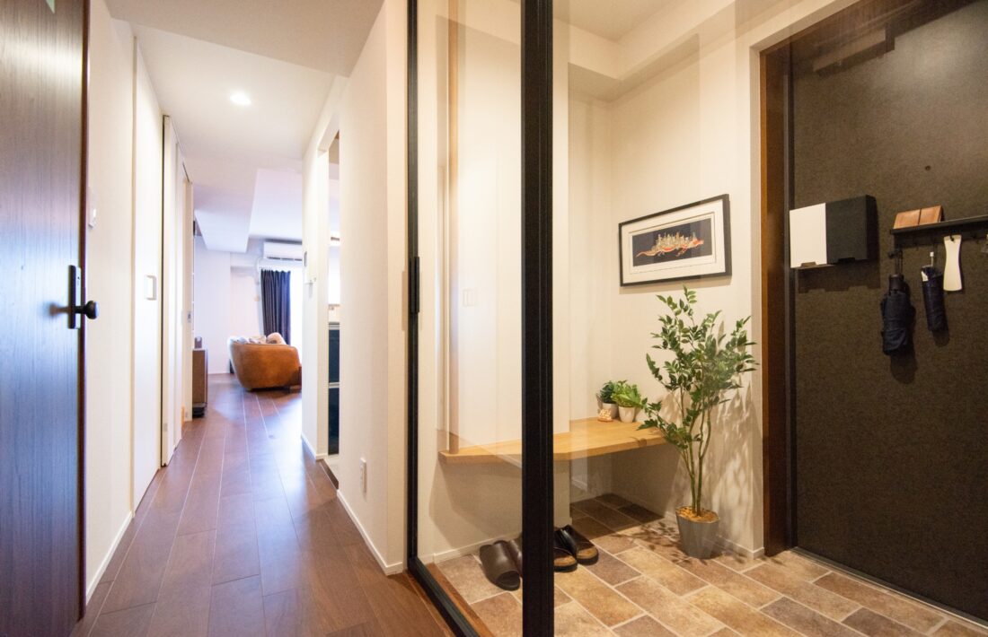 そして何より特徴的なのは、ガラスの引き違い戸がついていること。ペットのいるご家庭の要望に多いのが、安全のための柵の設置。ガラス戸なら、猫ちゃんたちが飛び出すのを防ぎつつ、玄関スペースを広く見せてくれます。また、玄関からの外気を遮断するので、室内の温度を保つ効果も期待できます。