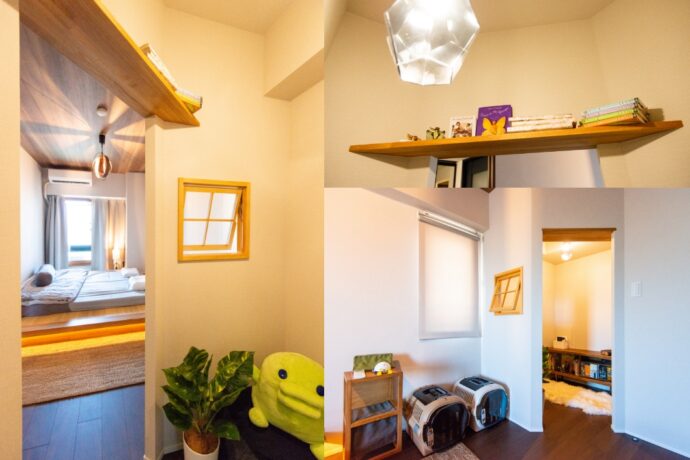 旅行がお好きというSさん夫妻、寝室は旅先で出会うような「リゾート」をイメージしたデザインに。既存では収納だった場所に小部屋もつくりました。ここは奥様のおこもりスペースです。「リモートワークスペースが主人のおこもりスペースで、ここは私のおこもりスペース。好きな本を読みふけったりして過ごしています。」と奥様。中には飾り棚や室内窓を設置、完全には閉じていないので、家族の存在を感じていられる、おこもりスペースです。