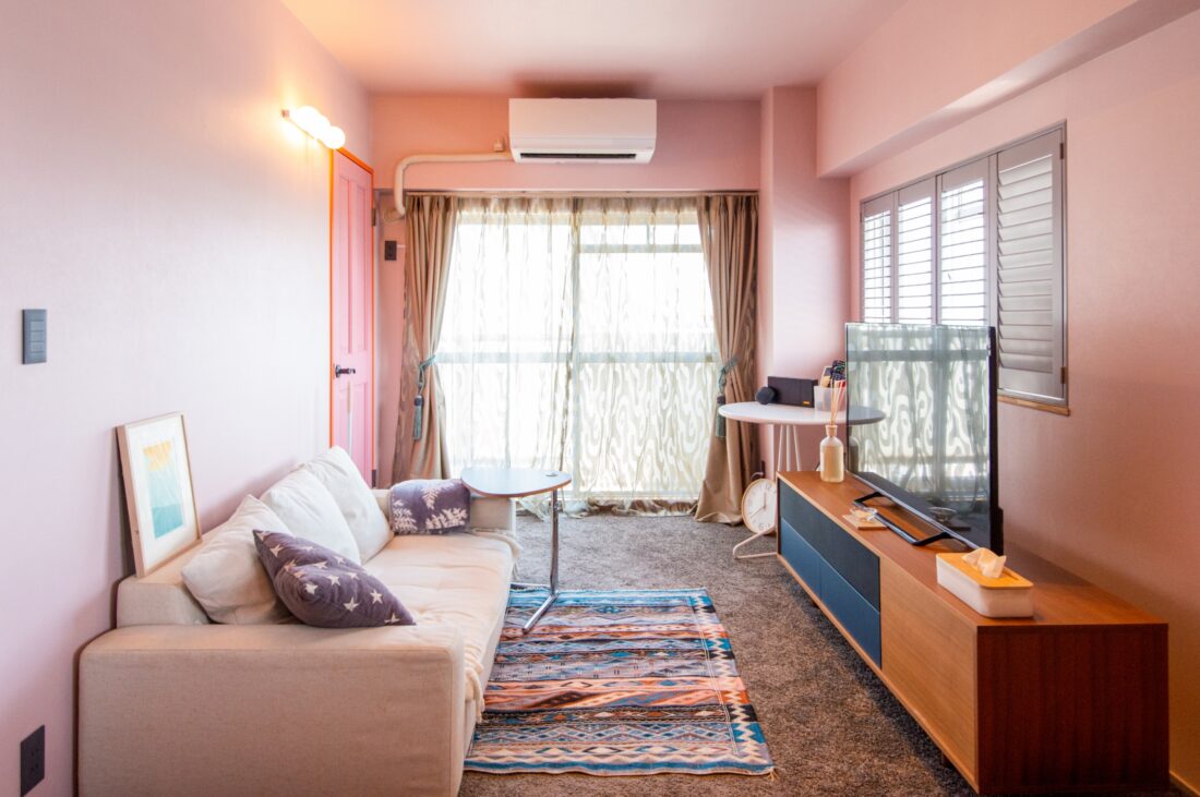 ピンクの壁に、グレーのウッドシャッターが印象的なリビング。マンションはサッシ枠まわりを変更できないこともありますが、事前に組合に掛け合い実現できました。