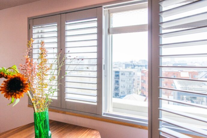 マンションでも実現出来たウッドシャッターの窓が印象的なリビング。