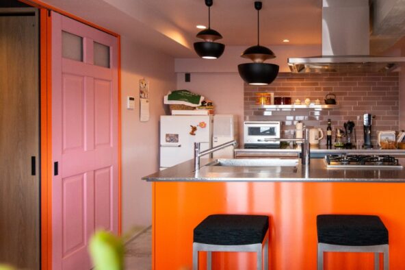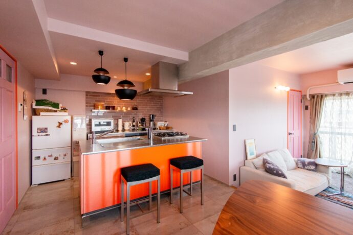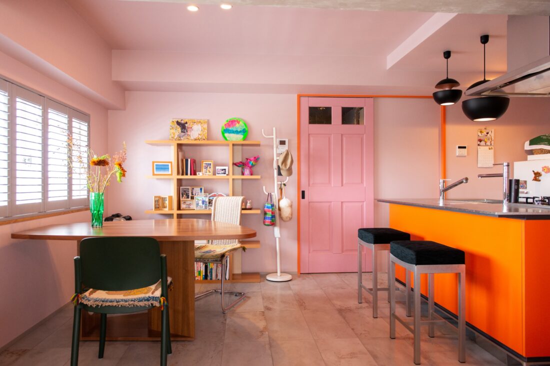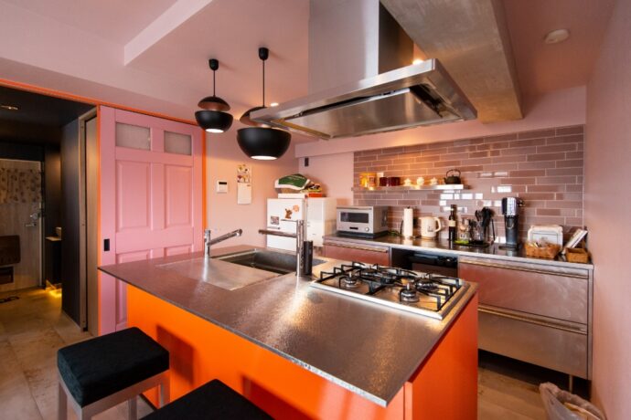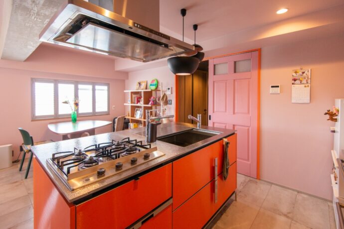 「白は使わないって自分で決めていたんです。このキッチンのオレンジには何色が合うかな…って考えて、ピンクの壁も扉も決めていきました。ワクワクする空間にしたかったんですよね。」と奥様。