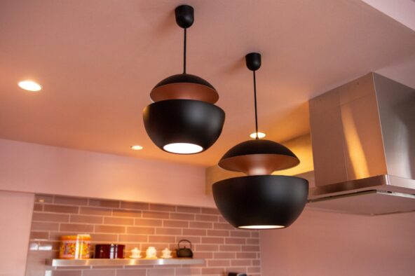 「通常ならキッチンと並行に2つラインを揃えて設置すると思いますが、前後にあえてずらしています。」と岩田。2つランプの高さと距離感が絶妙です。Tさん邸は、ダウンライトの位置も生活空間の用途に合わせて、細かに位置が決められています。一見しただけでは気づかないような細部に、緻密な計算があるんですね。