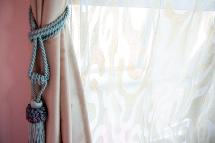 掃き出し窓には大胆な柄のレースカーテンにタッセルを合わせました。大きな柄や存在感のあるタッセルはコーディネートが難しいアイテムですが、ピンクの壁紙のお部屋では目立ち過ぎずちょうどいいバランス、奥様のセンスが光ります。