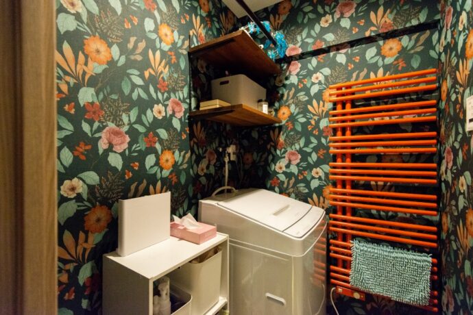 近年は洗面台をバスルームと分離し、独立させる設計が増えてきました。洗面を玄関先に設置すると来客時にも便利。Tさん邸も独立型、横の扉を開けばバス+ランドリースペースです。こちらの壁紙には大柄ながらアンティーク感のある落ち着いた花柄を選びました。濃いオレンジ色が可愛いPSのタオルウォーマーとの組み合わせが素敵です。「海外に行くとタオルウォーマーが必ずあって、日本は湿気が多いし、絶対欲しいなって思っていたんです。花柄の壁紙も可愛いでしょ。扉を開けたときに気分が変わるのがいいんです。」と奥様。