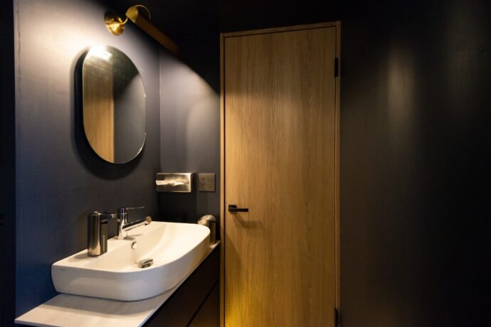 高級ホテルのような雰囲気漂う、洗面収納の下からフワッとこぼれる光。この洗面台下の間接照明は、玄関のフットライトとしての機能も兼ねています。仕込みライトはネット購入で1000円程度で設置できたそう。