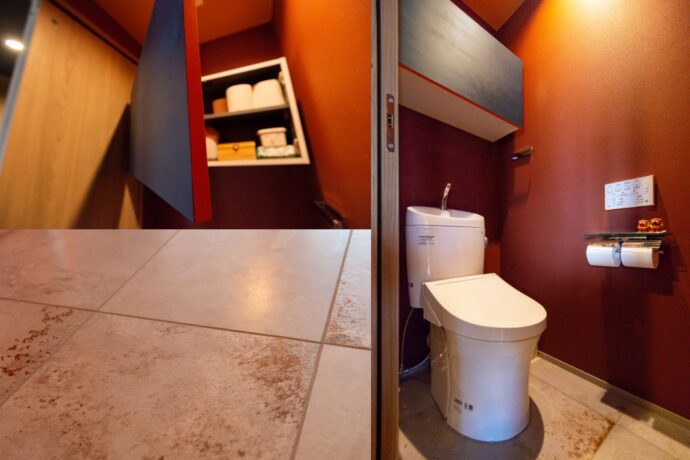 トイレの壁は、ウィリアム・モリスのキーカラーシリーズのシックな赤の壁紙をセレクト。床材のエイジング感のあるサビ鉄のような色味とマッチしています。