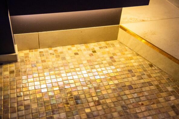 「この間接照明でタイルがキラキラして素敵なんです。」と奥様。タイルは奥様のセレクト。ベネツィアの工房で製作されたベネツィアンガラスのモザイクタイルで、光の反射で七色に変化します。上がり框のゴールドの見切りもポイントです。