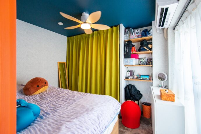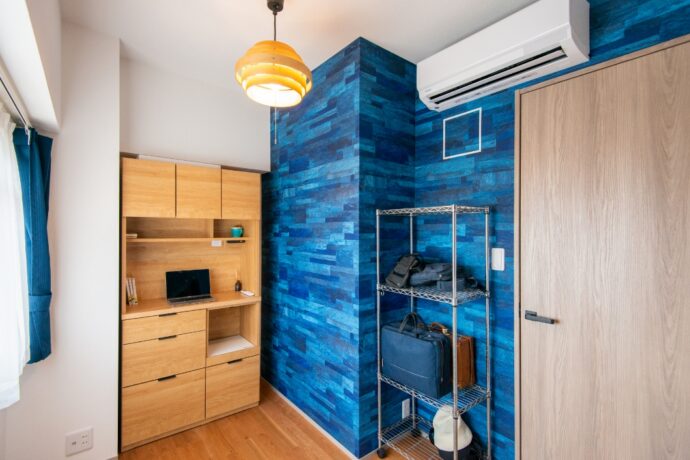 実は現在単身赴任中のご主人、間もなく一緒に暮らせるようになるそう。お互いの趣味を大切にされているお二人、それぞれのプライベートルームを設定しました。ご主人はお好きなブルーの壁紙をセレクト。これからベッドなど購入し、好みにつくり込んでいく予定。奥様のお部屋には推しのグッズがずらり。素敵にリノベーションしたリビングには趣味のものは置きたくないな…というとき、プライベートな空間を確保するのもアイデアですね。
