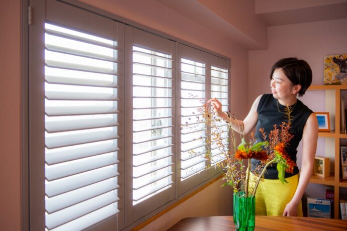 「海外旅行が好きで、あれ素敵だったな、こういうのいいなって、目にしたものを自然と取り入れていました。日本の家は白系の壁紙が多いけれど、ピンクいいでしょ。ウッドシャッターも珍しいかもしれないけれど、風でパタパタしないし、手でさっと調光できていいですよ。」と奥様。